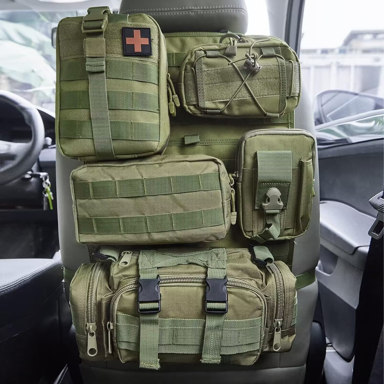 This tactical truck organizer features MOLLE panels with multiple compartments for secure storage in your vehicle's back seat. Made from durable Oxford cloth, it's ideal for outdoor activities, hiking, and hunting.